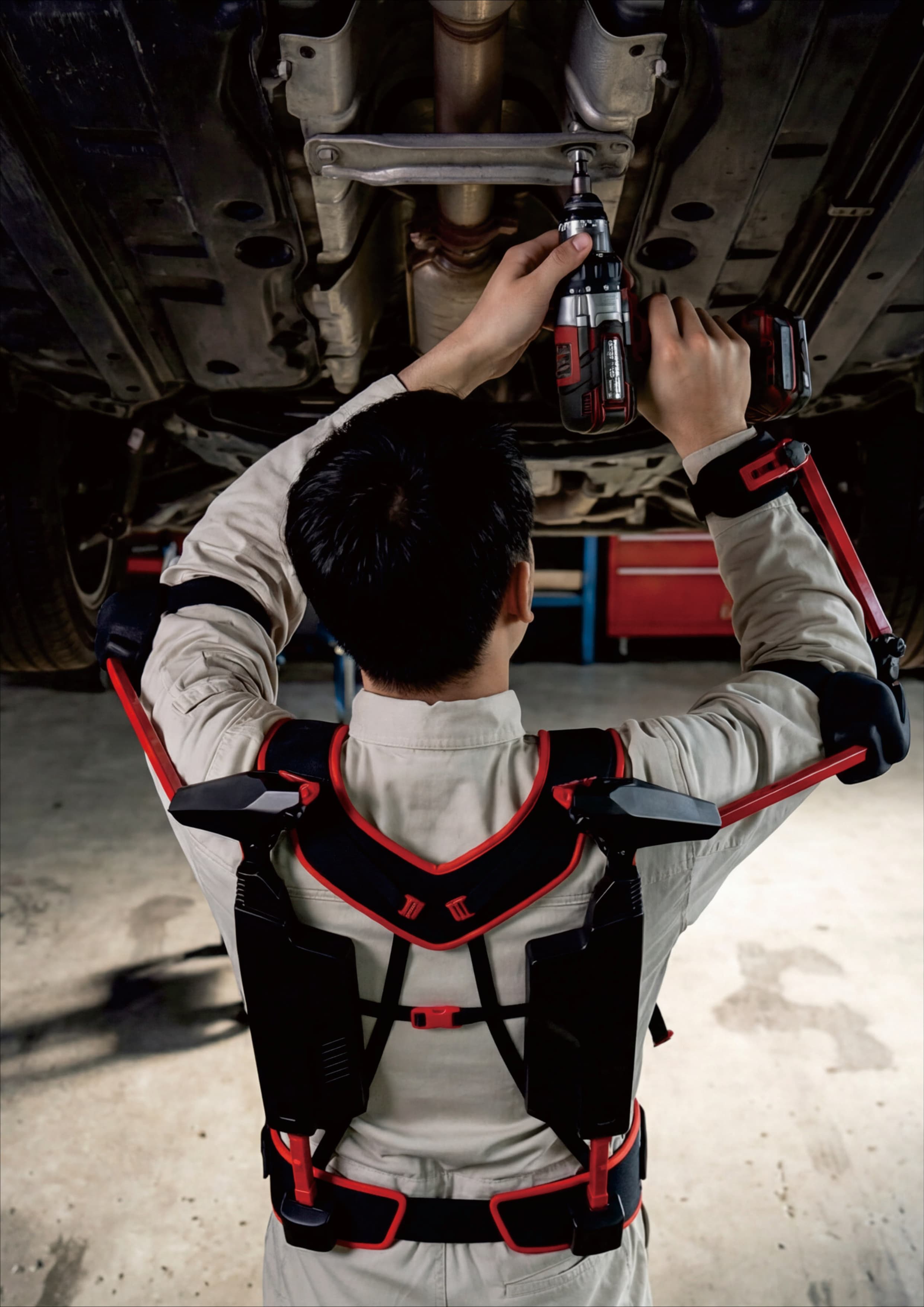 - Нет. AP1 спроектирован под высотные и потолочные работы — перфоратор, шуруповёрт, валик, кисть. Угол поддержки регулируется под конкретную задачу. Носится поверх рабочей одежды и совместим со стандартными СИЗ — каской, очками, респиратором.